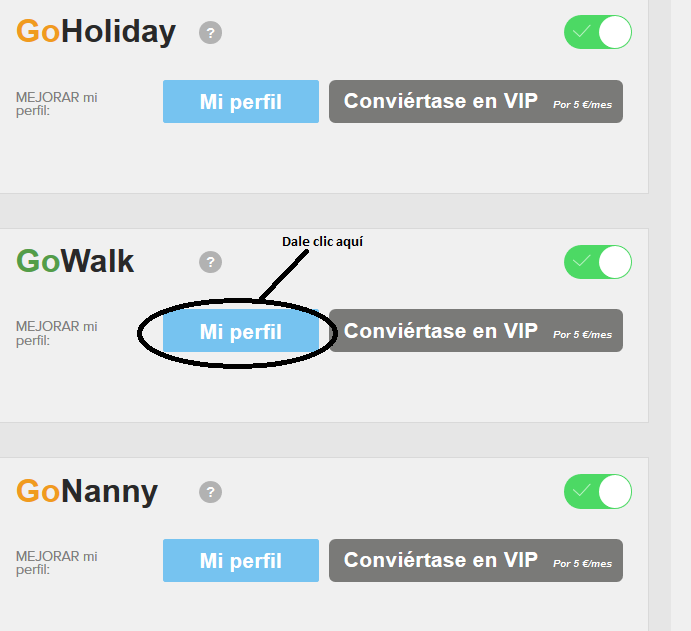 Para saber dónde puedes cambiar esto, inicia sesión en tu cuenta y haz clic en el icono "Ajustes". A continuación, haz clic en "Mi perfil" en la categoría GoWalk y podrás modificar el precio que cobras.