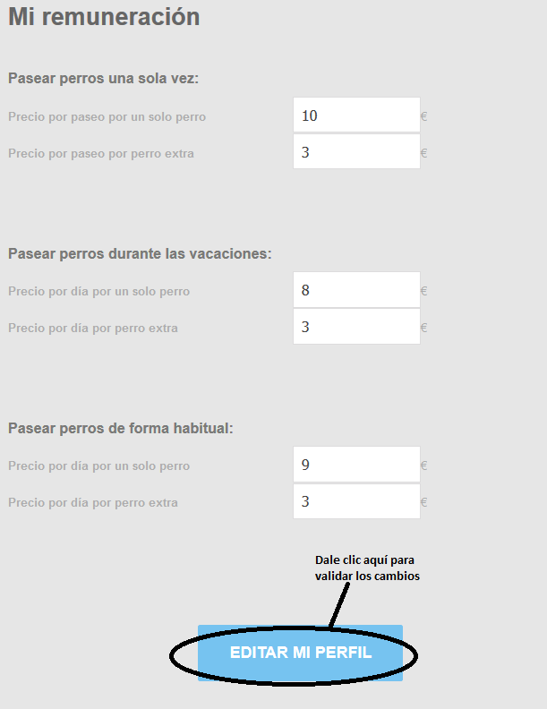 En Holidog, hemos decidido dejar a los cuidadores la libertad de ajustar sus propias tarifas en función del servicio que puedan ofrecer y de su nivel de experiencia. Si deseas ajustar tus tarifas, por favor sigue este proceso: