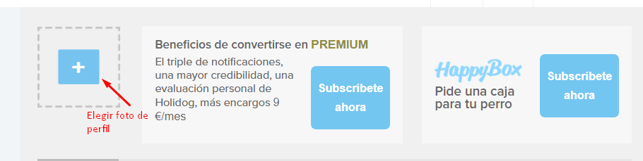 Para cambiar tu foto de perfil, primero ve a tu perfil http://es.holidog.com/Cuidador/Perfil/Informacion. Después haz clic en el "+" en la parte superior izquierda de la pantalla. Allí, serás capaz de subir una foto. Si quieres hacer lo mismo para tu mascota haz clic en el link a continuación. Podrás editar su perfil o añadir uno nuevo http://es.holidog.com/Cuidador/Perfil/Mascotas